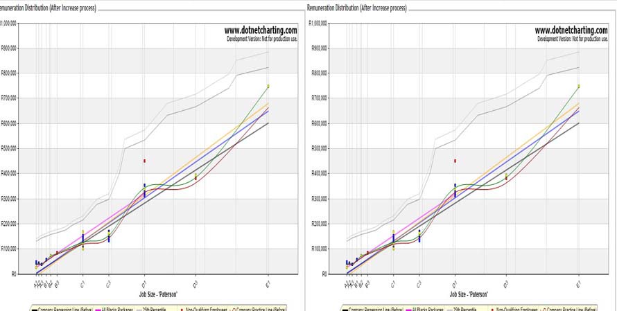 The below picture shows how you can view remuneration distribution prior (left hand column) and after (right hand column) the increase process from different financial years. In the left column you can see how remuneration distribution are unequal in the financial year for 2018, where in the right hand column we can see a more evenly spread remuneration distribution for the financial year 2019.